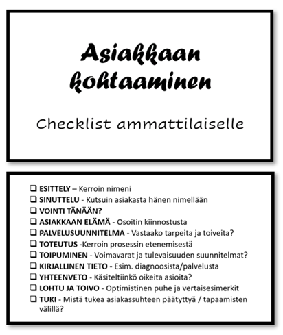 Tarkistuslistasta saat vinkkejä kohtaamisen toteuttamiseen ja rakennetta vastaanottoon. Lista on tehty tukeutuen aiempaan kirjallisuuteen.