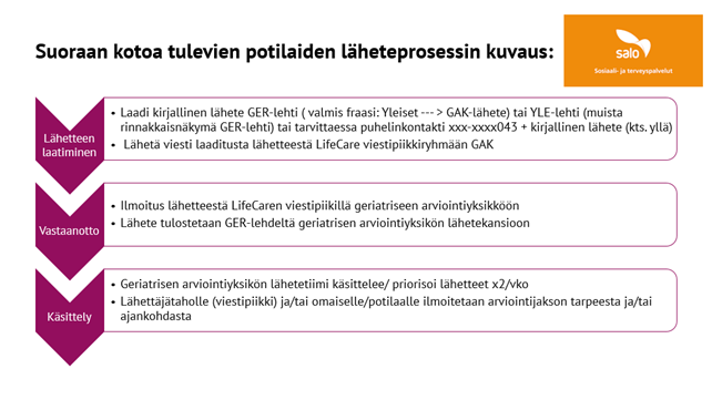 Kehittämisprojektina toteutettu gerontologisen asiantuntijuuden YAMK-opinnäytetyö liittyi Salon geriatrisen arviointiyksikön toiminnan kehittämiseen. Kehittämisprojektin tavoite oli kehittää ja selkeyttää geriatriseen arviointiyksikköön kotoa tulevien potilaiden läheteprosessia ja samalla mahdollistaa arviointijakson oikea-aikainen saavutettavuus. Kehittämisprojekti toteutettiin yhteistyössä Salon terveys- ja vanhuspalveluiden kanssa.