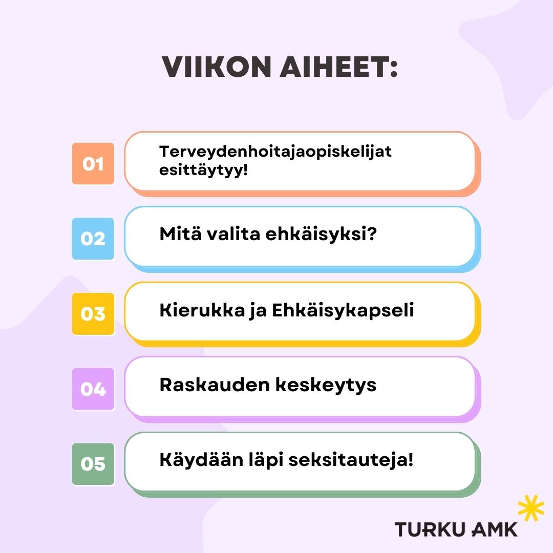 Terveydenhoitajaopiskelijat toimivat viikon ajan Instagram-tilien @vstulevaisuuden_sote ja @turkunehkaisyneuvola sisällöntuottajina. Toiminta kuului osaksi terveydenhoitotyön kehittämistyötä, jossa hyödynnettiin sosiaalista mediaa seksuaali- ja lisääntymisterveyden edistämisessä. Ehkäisyviikko onnistui hyvin, ja yhteistyö oli toimivaa. Tuotettu sisältö oli ammattimaista ja visuaalisesti selkeää.